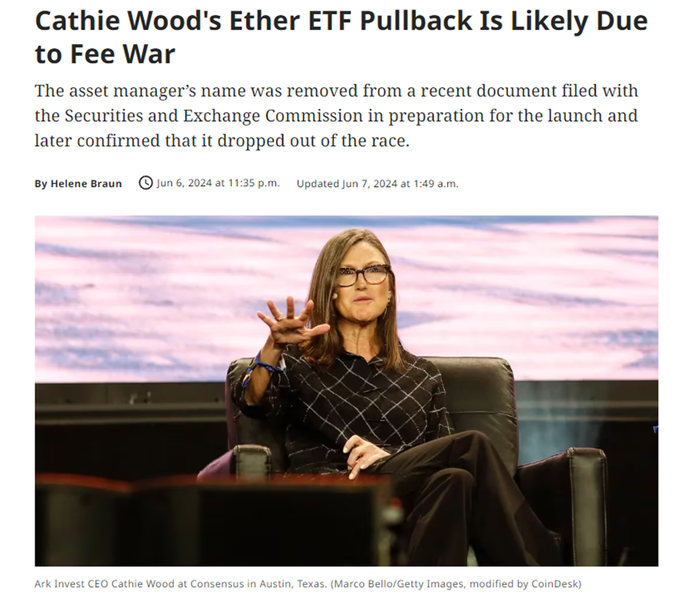 因为它有可能不赚钱。 上周,“木头姐”(Cathie Wood)的方舟基金决定撤回 ETH ETF 申请。