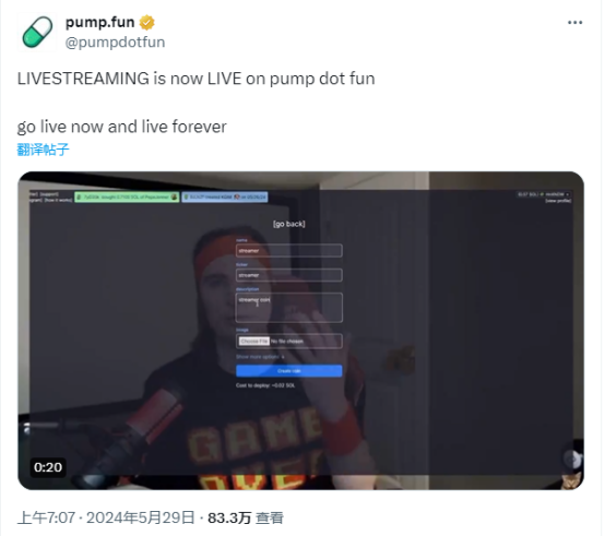 就在不久前,Pump.fun成功让这个想法变成了现实。5月29日,meme币发行平台Pump.fun在X平台宣布上线直播(LIVE STREAMING)功能。