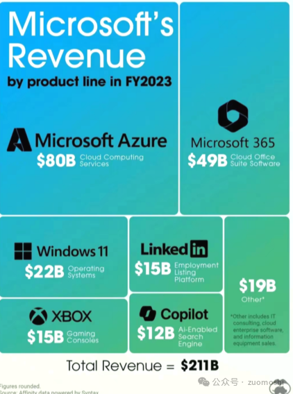 最典型的就是微软的Copilot。这个产品在一年间的产品收入几乎是拉着直线上升(还不是什么指数曲线)。