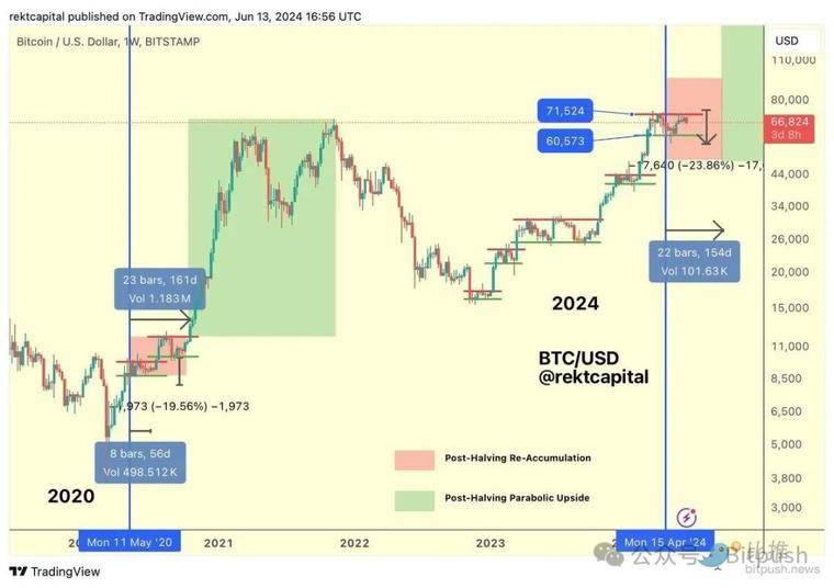 Rekt Capital 表示:“这种持续的盘整使价格能够与历史减半周期重新同步,这样我们就可以实现正常的牛