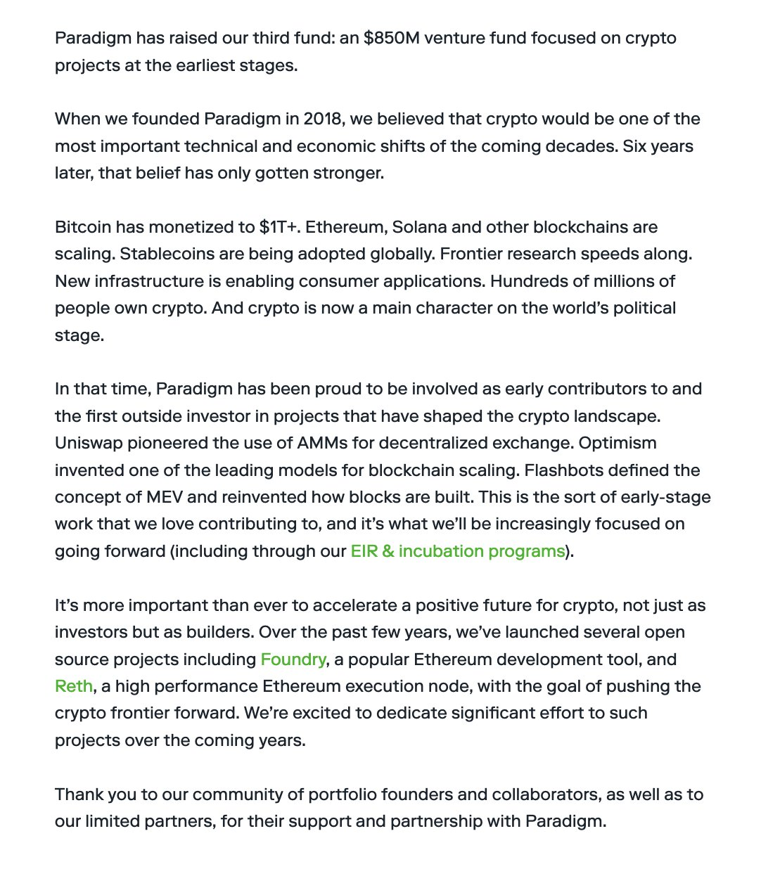 除此以外,Matt Huang表示,“在2018年创立Paradigm时,团队相信 加密货币 将成为未来几十年最重要的技术和经济变革之一。六年后的今天,这种信念变得更加坚定。