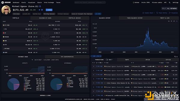 6月13日凌晨,Arkham在X上发文表示,Curve创始人Michael Egorov目前面临1.4亿美元CRV代币的清算风险。Egorov在五个不同协议上的五个账户中,以约1.41亿美元的CRV代币为抵押,借入了约9570万美元的稳定币,主要是crvUSD。维持这些借款的年化利息成本高达6000万美元。