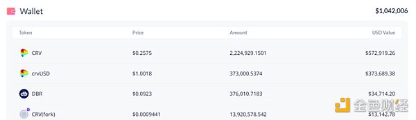 目前,Egorov主地址(0x7a1...428)上的仓位显示,CRV数量约为222万枚,钱包总价值约为104万美元。