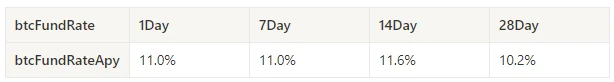过去一周 BTC 资费平均年化收益为 11% ,合约杠杆情绪维持普通水平。