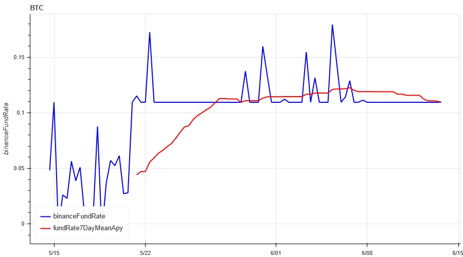 蓝色线为币安上 BTC 的资金费率,红色线为其 7 日平均