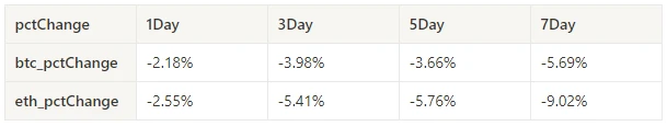 过去一周 BTC 价格下跌-5.69% ,ETH 价格下跌-9.02% 。