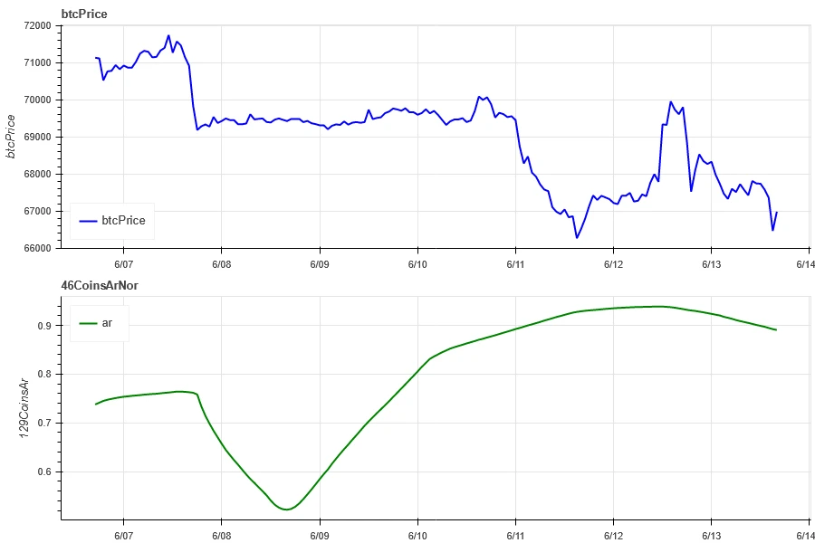 上图蓝色先为比特币价格,绿色线为['1000 floki', '1000 lunc', '1000 pepe', '1000 shib', '100 0x ec', '1inch', 'aave', 'ada', 'agix', 'algo', 'ankr', 'ant', 'ape', 'apt', 'arb', 'ar', 'astr', 'atom', 'audio', 'avax', 'axs', 'bal', 'band', 'bat', 'bch', 'bigtime', 'blur', 'bnb', 'btc', 'celo', 'cfx', 'chz', 'ckb', 'comp', 'crv', 'cvx', 'cyber', 'dash', 'doge', 'dot', 'dydx', 'egld', 'enj', 'ens', 'eos','etc', 'eth', 'fet', 'fil', 'flow', 'ftm', 'fxs', 'gala', 'gmt', 'gmx', 'grt', 'hbar', 'hot', 'icp', 'icx', 'imx', 'inj', 'iost', 'iotx', 'jasmy', 'kava', 'klay', 'ksm', 'ldo', 'link', 'loom', 'lpt', 'lqty', 'lrc', 'ltc', 'luna 2', 'magic', 'mana', 'matic', 'meme', 'mina', 'mkr', 'near', 'neo', 'ocean', 'one', 'ont', 'op', 'pendle', 'qnt', 'qtum', 'rndr', 'rose', 'rune', 'rvn', 'sand', 'sei', 'sfp', 'skl', 'snx', 'sol', 'ssv', 'stg', 'storj', 'stx', 'sui', 'sushi', 'sxp', 'theta', 'tia', 'trx', 't', 'uma', 'uni', 'vet', 'waves', 'wld', 'woo', 'xem', 'xlm', 'xmr', 'xrp', 'xtz', 'yfi', 'zec', 'zen', 'zil', 'zrx’]整体的相关性