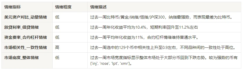 过去一周选中的 129 个币中相关性上升至 0.9 左右,不同品种间的一致性处于高位。
