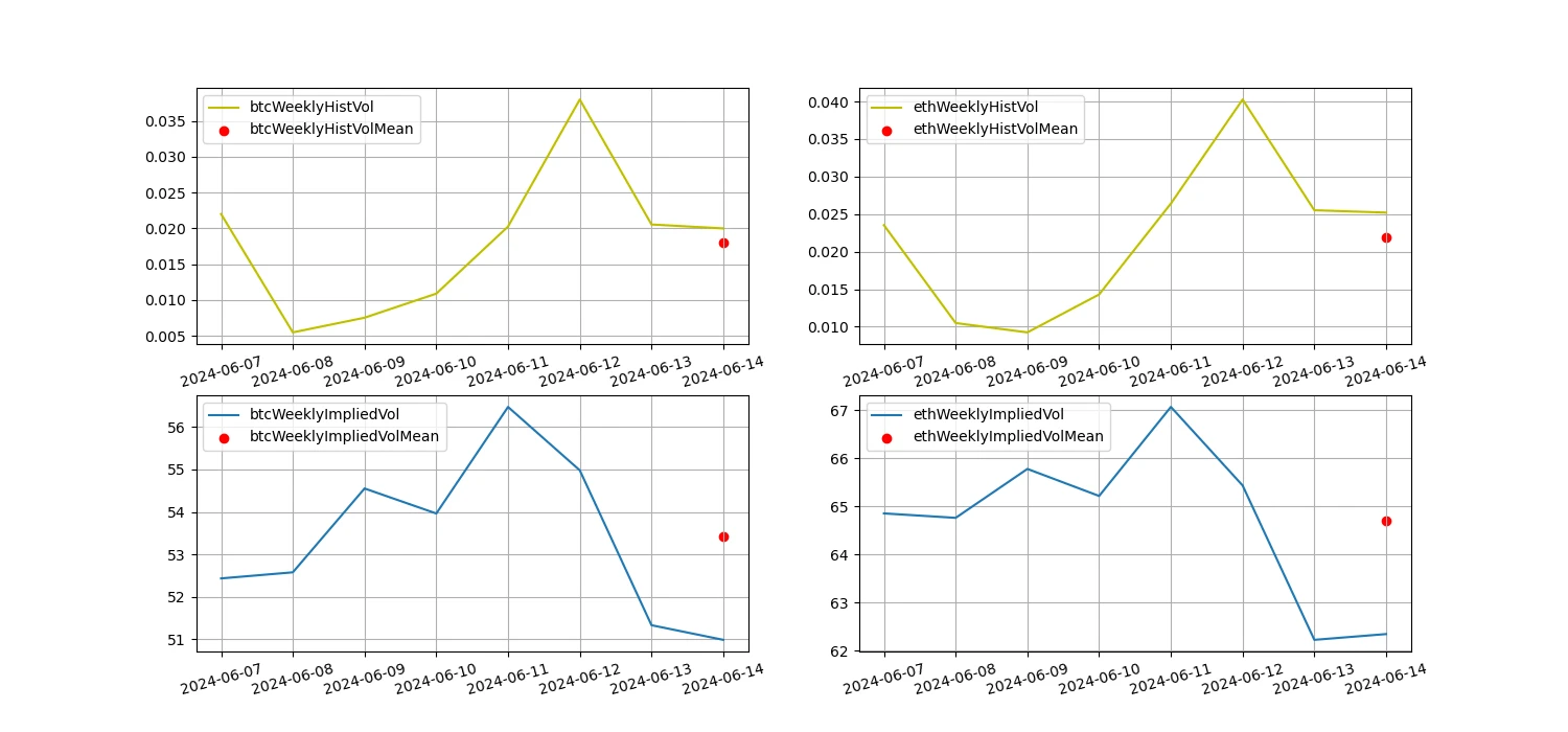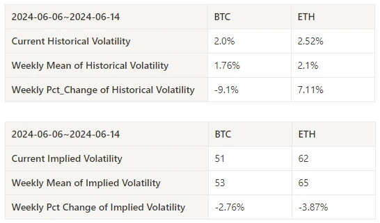 过去一周历史波动率 BTC 与 ETH 在 6.12 数据公布时最高;隐含波动率 BTC 与 ETH 有下降。