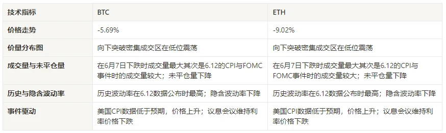 在过去一周,比特币(BTC)和以太坊(ETH)的价格都经历了两次下跌,波动率在 6 月 12 日的数据公布时达到了历史最高点。比特币和以太坊的成交量在 6 月 7 日的下跌时达到了最高水平,随后在 6 月 12 日的数据公布时也有较大的成交量。比特币和以太坊的未平仓合约量略有下降,隐含波动率也有所下降。此外,比特币的资金费率保持在一般水平,市场宽度指标显示大部分币种回到下跌趋势。在事件方面,主流币的价格在美国 CPI 数据公布后上涨,随后在美联储议息后再次下跌。