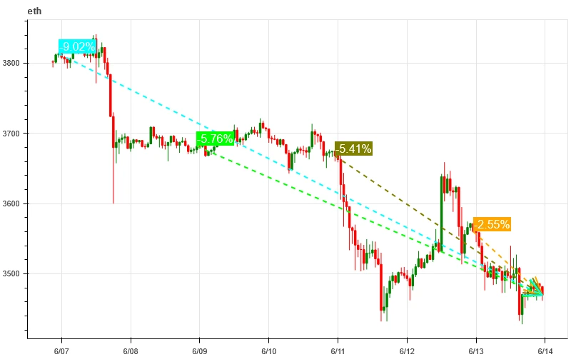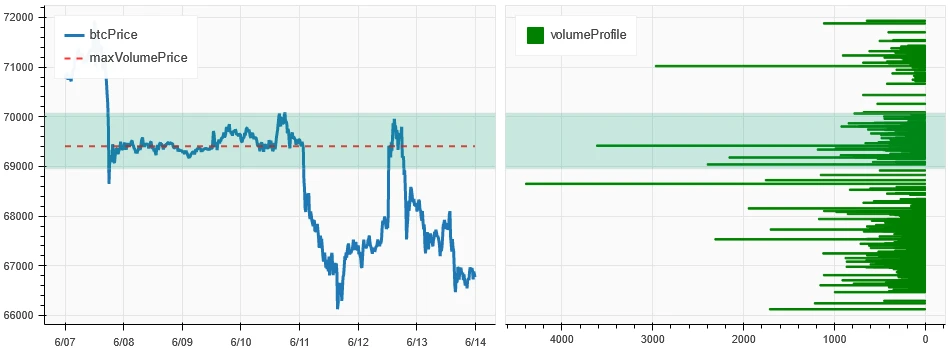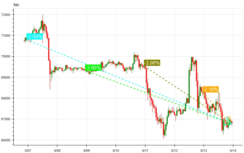 在事件方面, 6.12 20: 30(北京时间)美国 CPI 低于预期,数据公布后比特币从 68000 美元短时间内涨到 70000 美元,上涨 3% ,随后的 6.13 02: 00(北京时间)美联储议息会议公布维持利率后,比特币价格从 70000 美元下跌至 67000 美元,下跌-4.3% 。