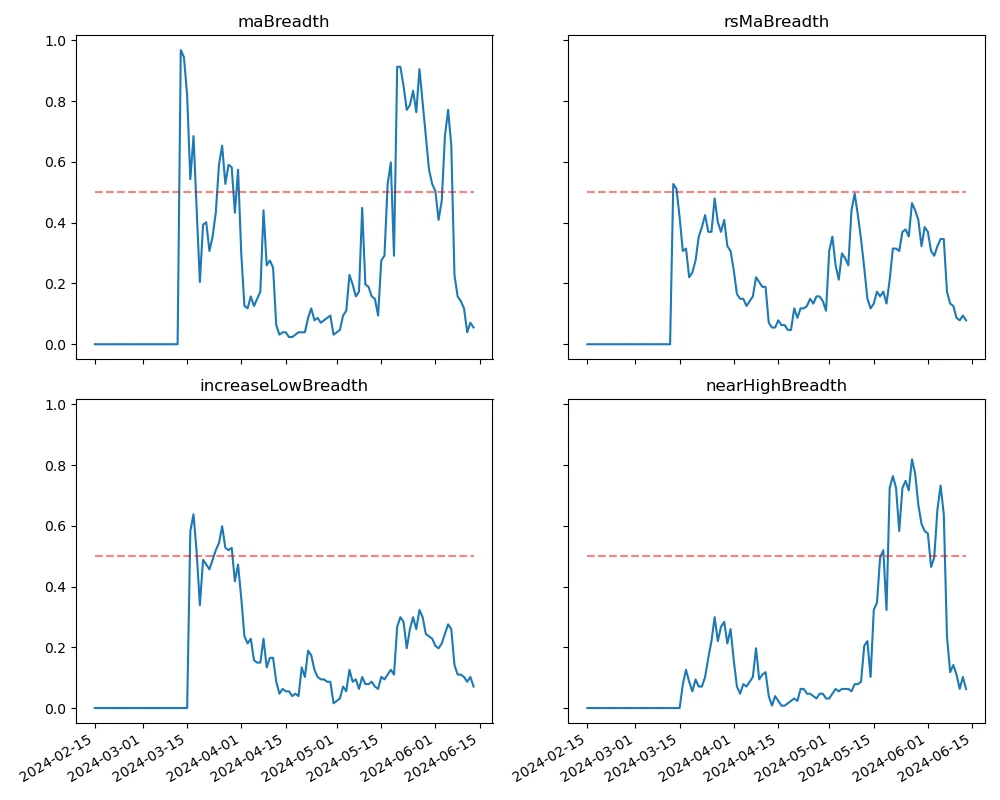 过去一周选中的 129 个币,价格在 30 日均线上方的占比为 5.5% ,相对 BTC 价格在 30 日均线上方占比为 7.8% ,距离过去 30 天最低价大于 20% 的占比为 7% ,距离过去 30 天最高价小于 10% 的占比为 6.3% ,过去一周市场宽度指标显示整体市场处于大部分币回到下跌态势。
