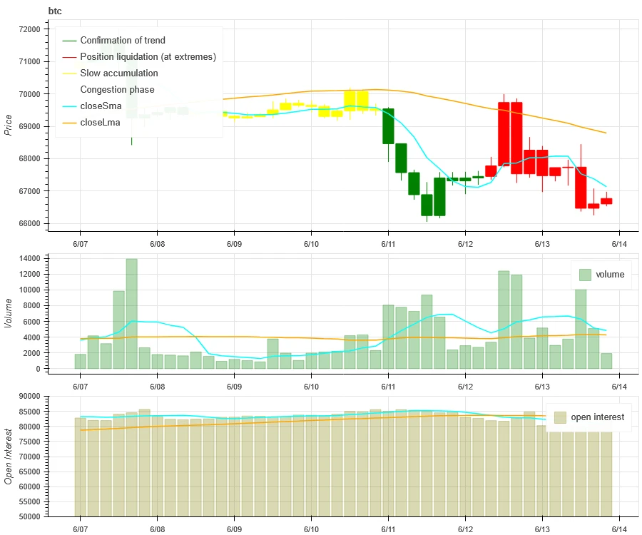 上图最上方 BTC 的价格走势,中间是成交量、最下方是未平仓量、浅蓝色是 1 天均值,橘色是 7 天均值。其中 K 线的颜色代表当前的状态,绿色是价格上升有成交量支持,红色是在平仓,黄色是在缓慢累积仓位,黑色是拥挤状态。