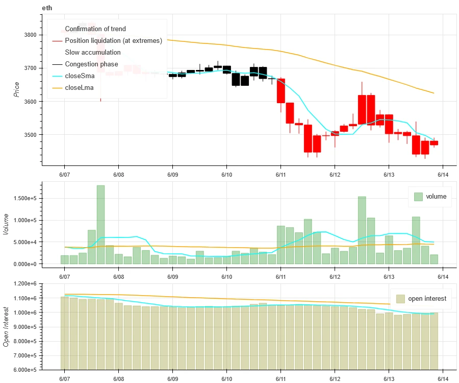 上图最上方 ETH 的价格走势,中间是成交量、最下方是未平仓量、浅蓝色是 1 天均值,橘色是 7 天均值。其中 K 线的颜色代表当前的状态,绿色是价格上升有成交量支持,红色是在平仓,黄色是在缓慢累积仓位,黑色是拥挤状态。