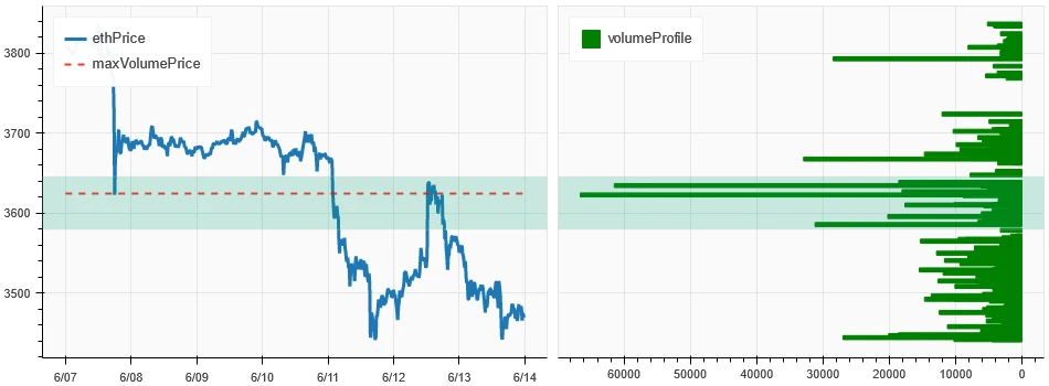 表格显示 BTC 与 ETH 过去一周中每周的密集成交区间