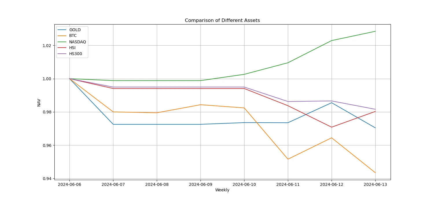 过去一周比特币/黄金/纳指/恒指/沪深 300 中,纳指最强势,而表现最差为比特币。