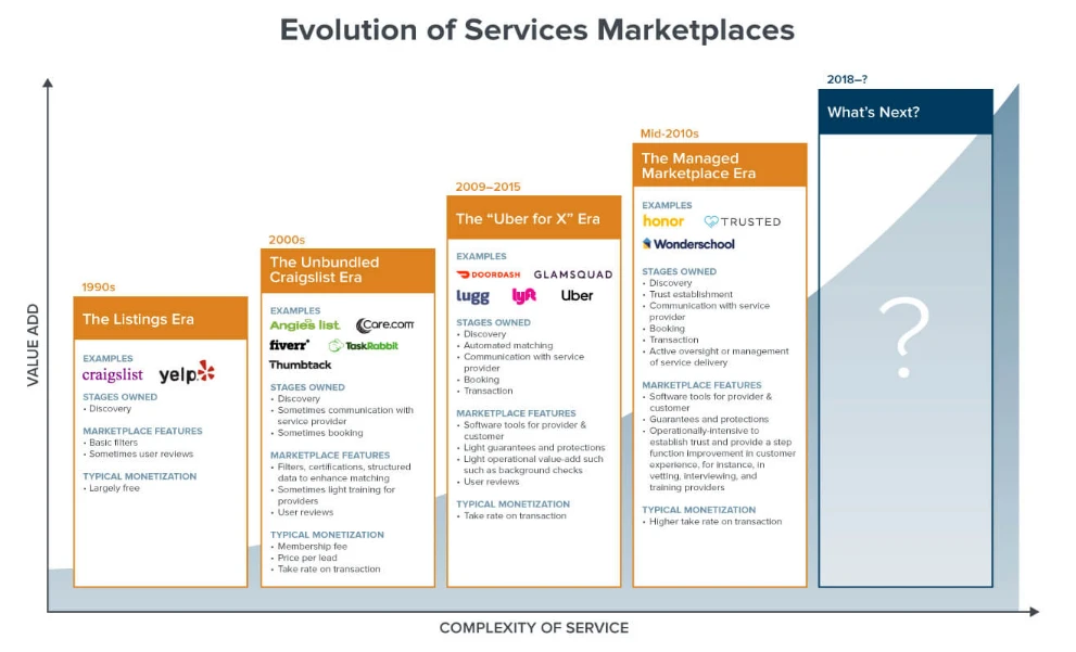 我之前写过关于服务市场的时代,具体来说,互联网市场从上世纪 90 年代的列表时代(以 Craigslist 为代表)逐步发展到「Uber for X」时代的按需应用(2009-2015 年),再到管理型市场的时代(2010 年代中期)。