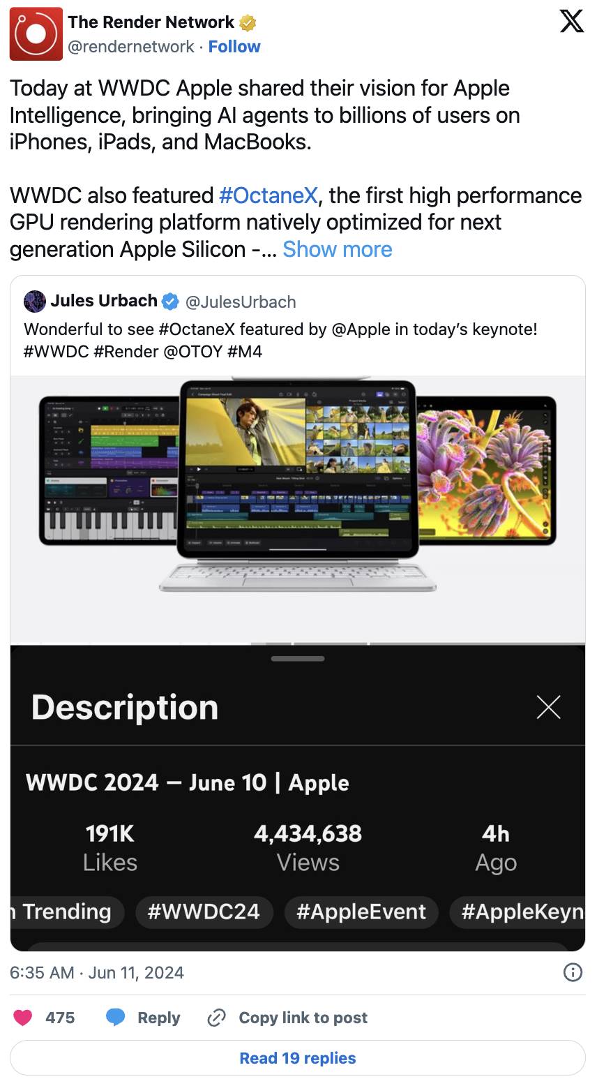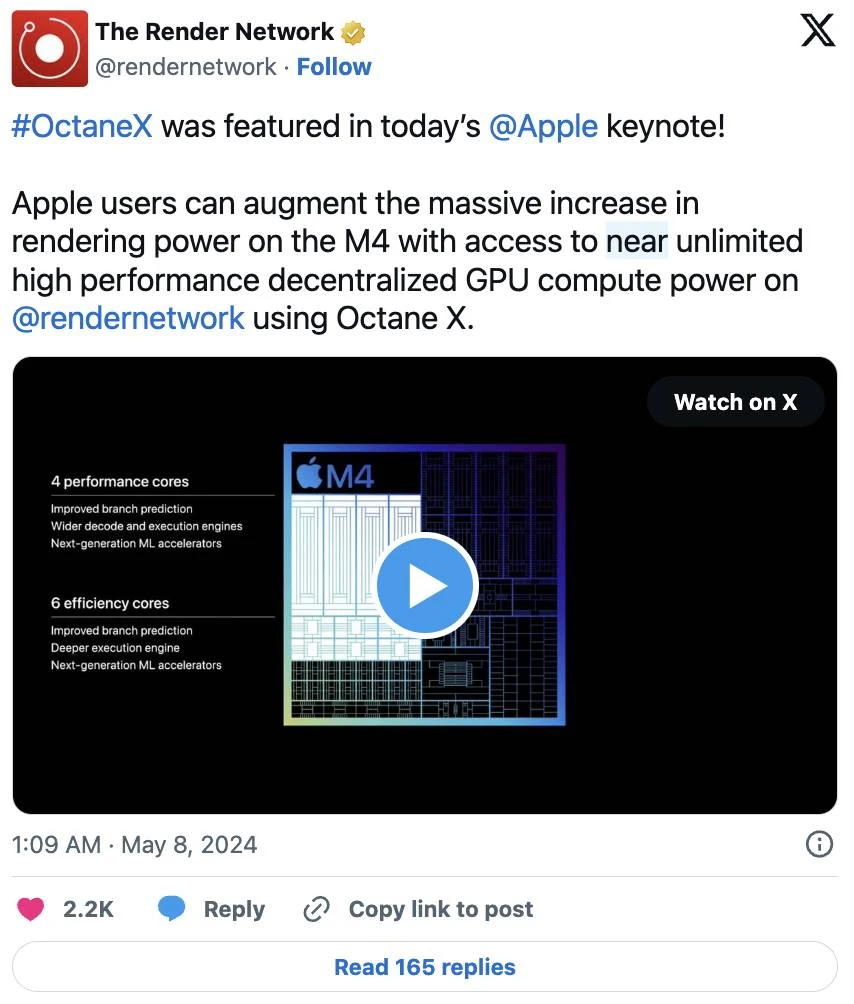 在今年的 WWDC 大会上,Apple 发布了 Apple Intelligence ,这是其新推出的 AI 功能套件,适用于所有设备。每个大型科技公司都在加入 AI 的行列,这并不令人意外。真正引人注目的是在最新的 iPad Pro 上展示的 OctaneX,这是一款由 Render Network 支持的3D设计软件。