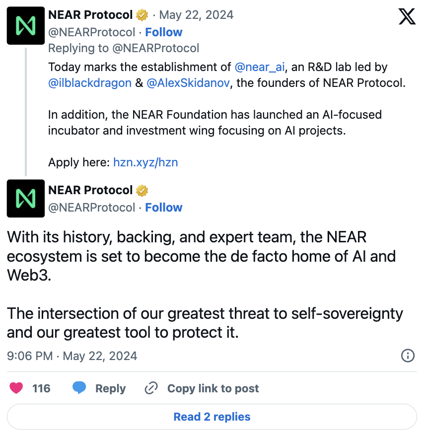 这不仅仅是炒作。NEAR 基金会正在实际行动。他们正在建立一个专门的研究实验室( NEAR.AI ),并 吸引顶尖的 AI 人才 开发 AI 与加密应用,还设立了一个孵化器和投资部门,专注于 AI 项目。