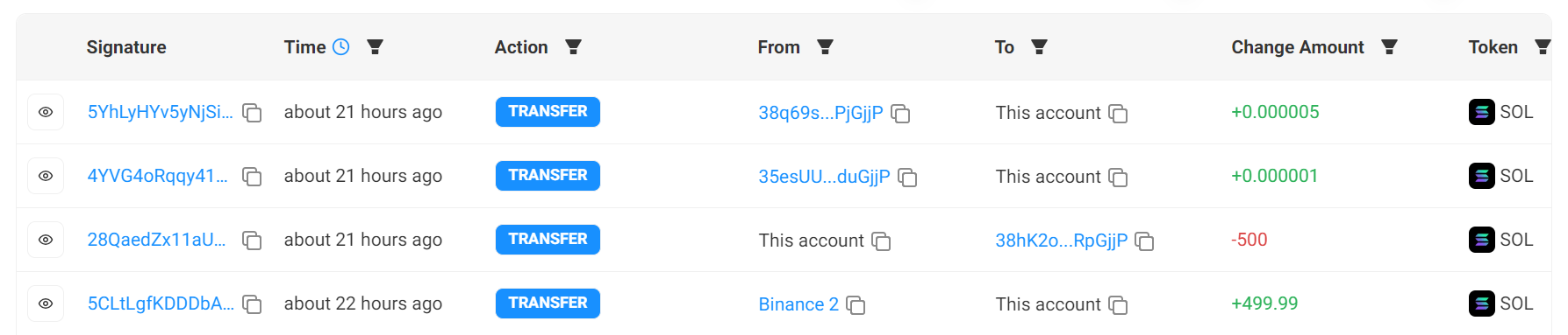 而据 Solscan 数据 ,Crypto Wilson 的币安地址在昨日下午 1 时 34 分将 500 枚 SOL 转至 B6co6zZpZvNFwD6KRazJyUyaRcHgLev9dzgEAFbXJg3R,没想到该地址在下午 2 时 23 分便将 500 枚 SOL 转回 38hK2oCFpWTsRqgZn6dSgoeZk9jyKuqE7pFRJURpGjjP。