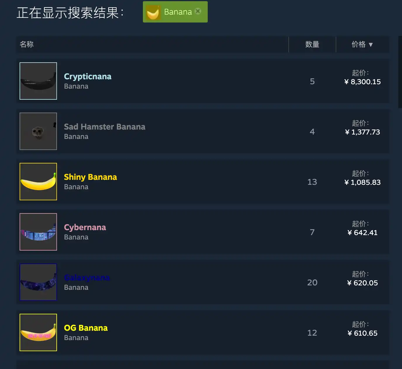 由于 Steam 内置二级市场,你可以直接把这个掉落的香蕉放到市场上去挂单。那么问题来了,不同类型的香蕉到底值多少钱?