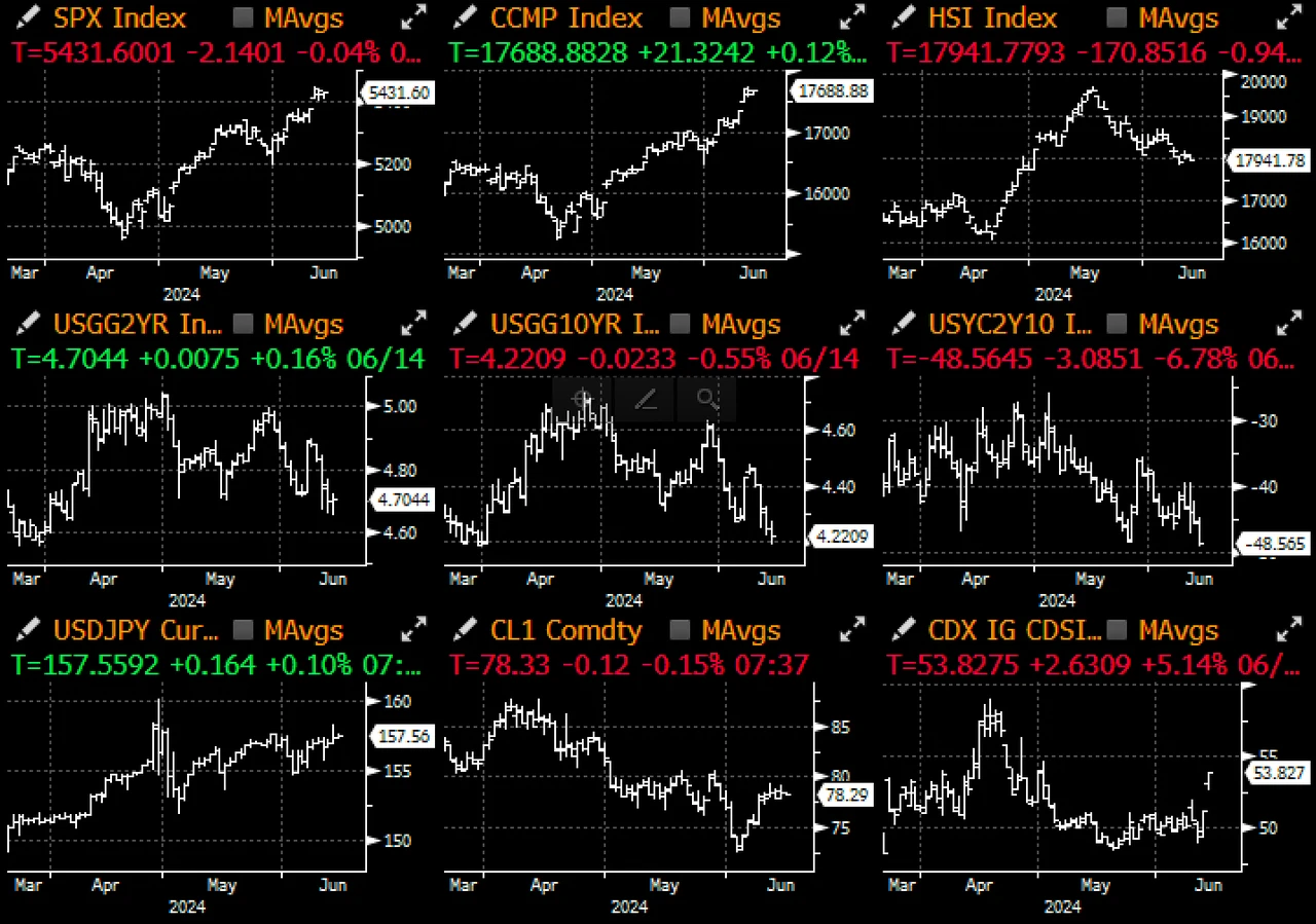 其他宏观资产大部分保持稳定,得益于 AI 乐观情绪,SPX 指数和 Nasdaq 指数仍徘徊在年初至今的高点附近,但领先族群日益缩小的问题依然明显,仅有 AI 相关股票特别突出。