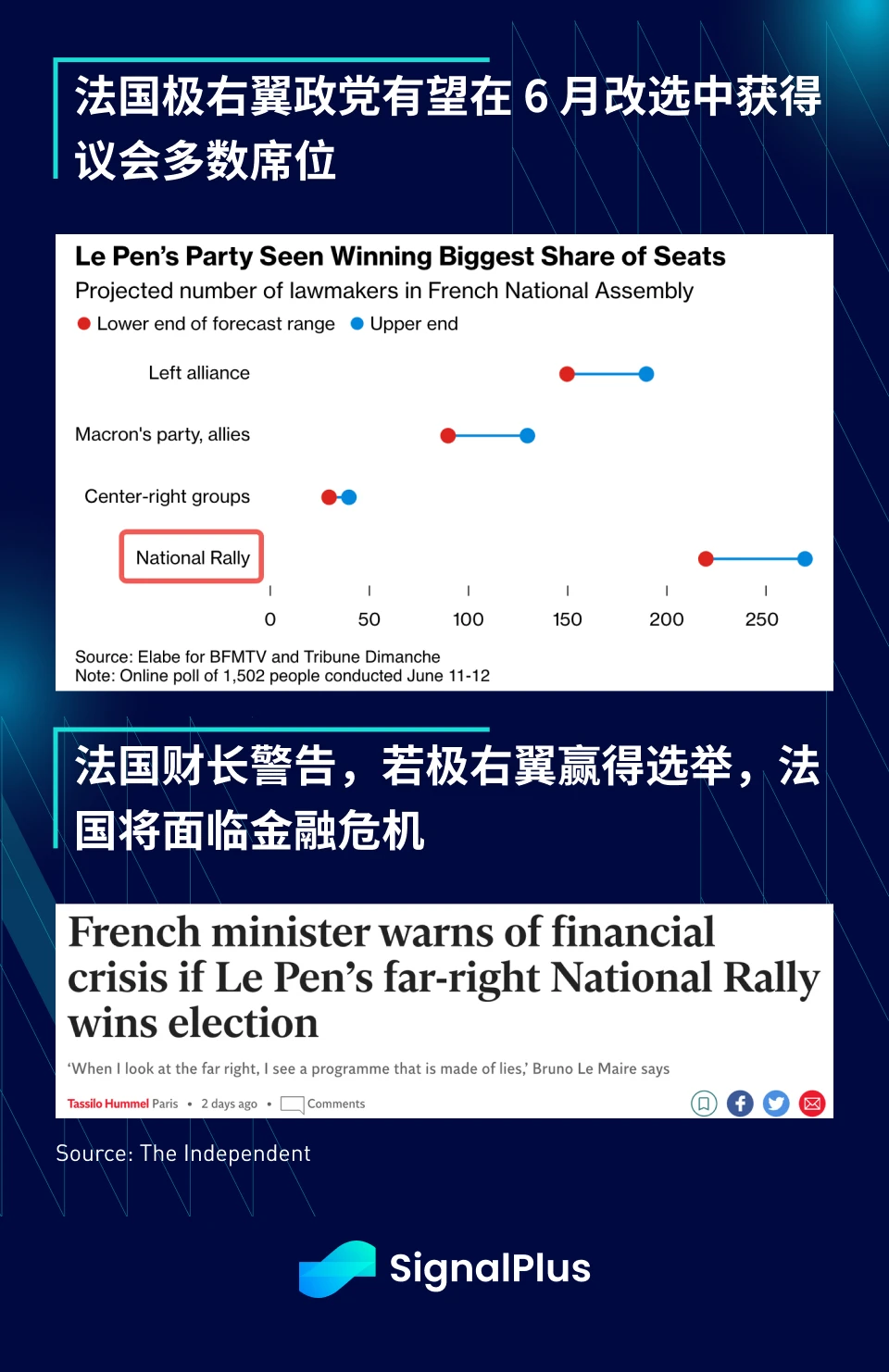 全球政治再次成为焦点,在其盟友在上周欧洲议会选举中惨败后,法国总统 Macron 意外宣布解散国会、重新选举。由 Le Pen 领导的 RN/National Rally 在民调中取得显著进展,似乎表明极右翼政党在 6 月 30 日的选举中有望获得绝对多数,这使得“法国脱欧”的风险增加,现任财长也对可能引发的金融危机发出警告。