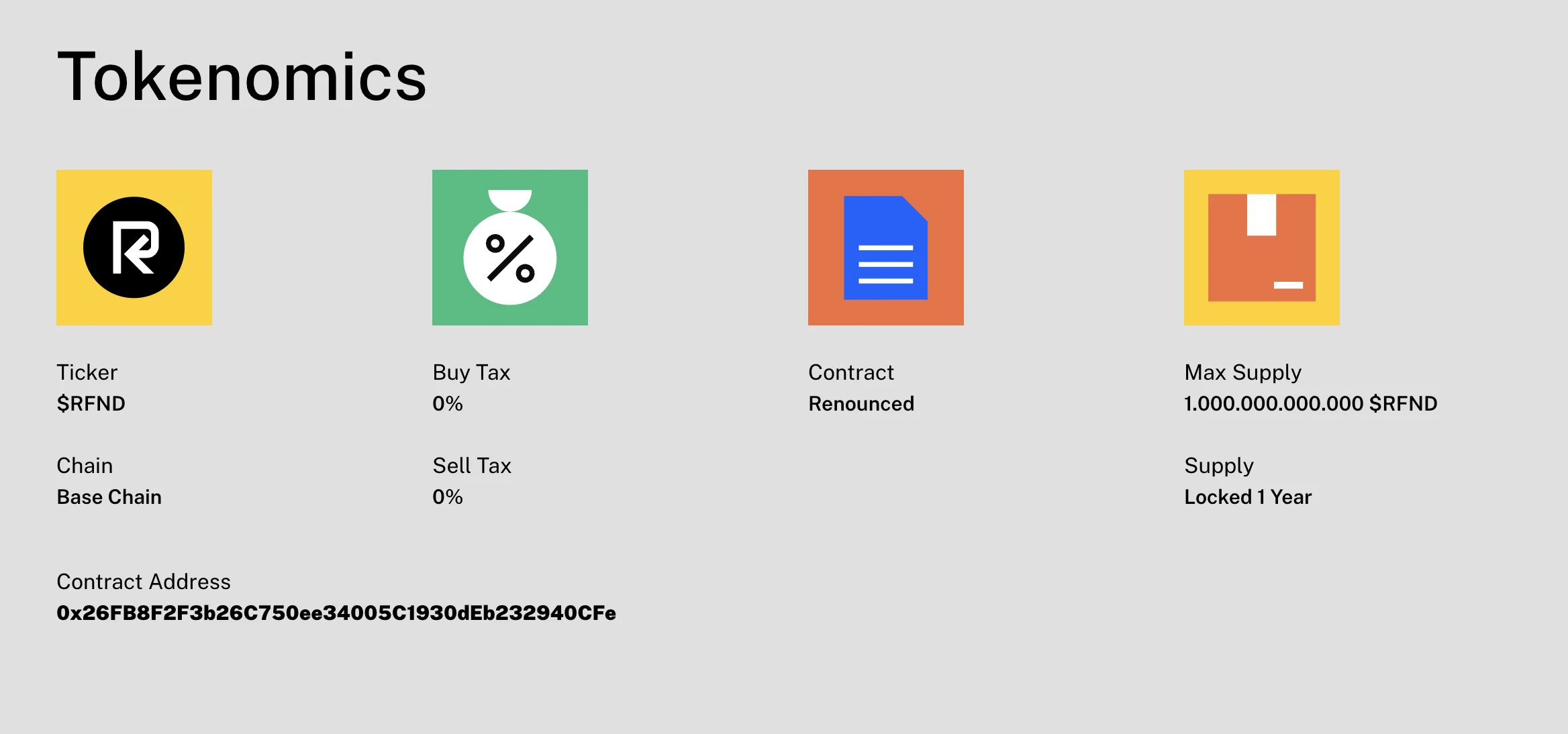 同样根据其官网信息得知,RFND 代币部署于 Base 网络,领取相应代币无需 Gas 费用,合约地址为 0x26FB8F2F3b26C750ee34005C1930dEb232940CFe,买卖税为 0,代币最大供应量为 10000 亿枚,锁仓1年。
