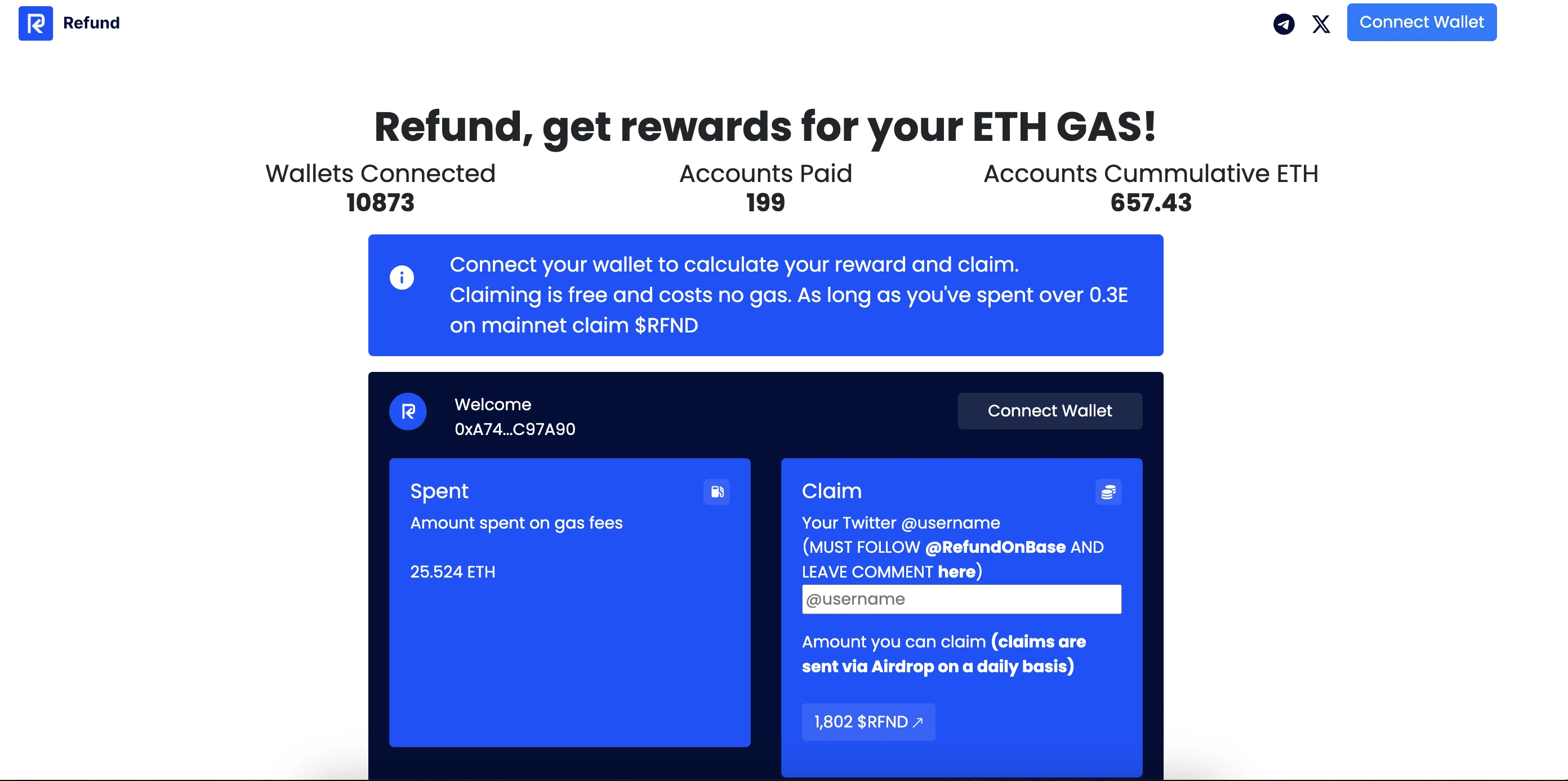 此前,Solana 生态的 Claim Your SOL 项目 就曾发起过领取自己被 Solana 网络“扣留的账户租金”;而现在,以太坊L2网络里面的“当红炸子鸡” Base 生态也出现了一个类似的项目—— RefundOnBase ,同样是主打“代币返还”概念。不同的是,这个项目是根据用户在以太坊网络消耗的 Gas 多少,返还一定的 RFND 项目代币。