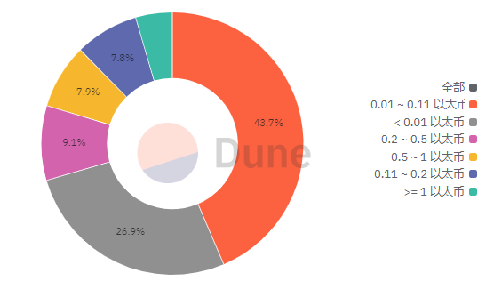 数据也如出一辙,根据Dune数据,用户平均桥接的ETH数量仅为1.37枚,超过80%用户的桥接数量低于1ETH,仅1.3%的地址余额超过10 ETH,可以看出zkSync的主要用户仍是奔着空投而来,而非大资金使用者。