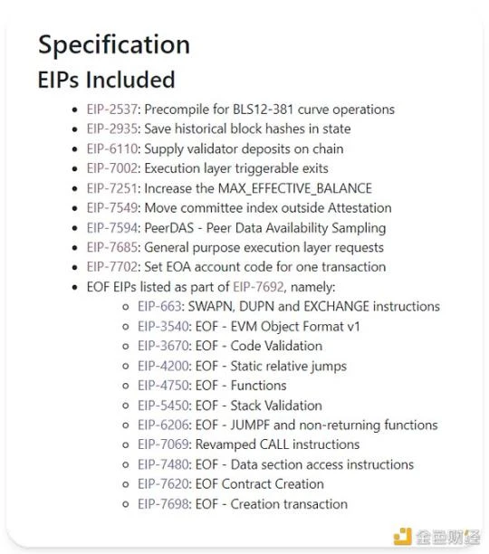 对于 Pectra 升级,目前计划纳入 9 个标准 EIP 和一个由另外 11 个组成 EIP 组成的元 EIP。