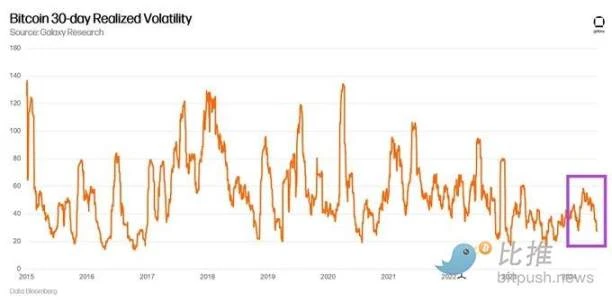 自 3 月份以来,比特币一直在窄幅区间内横盘整理。数字资产投资公司 Galaxy 研究主管 Alex Thorn 在 X 帖子中指出,比特币 30 天实际波动率已降至接近历史最低水平,这凸显了无聊的价格走势。