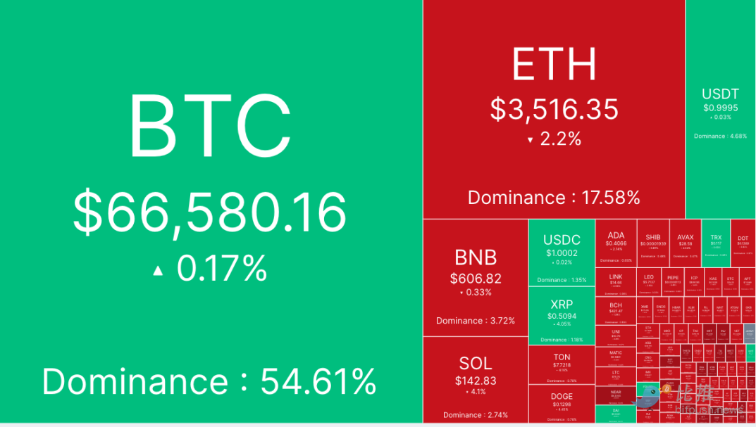 比推数据显示,比特币在早盘交易中跌破 66, 000 美元的支撑位,午盘时触及 65, 046 美元的低点,随后买盘激增推动价格回升至 67, 286 美元,然而看涨势头未能持续,截至发稿时,比特币价格为 66, 580.16 美元, 24 小时波动率接近为 0% 。