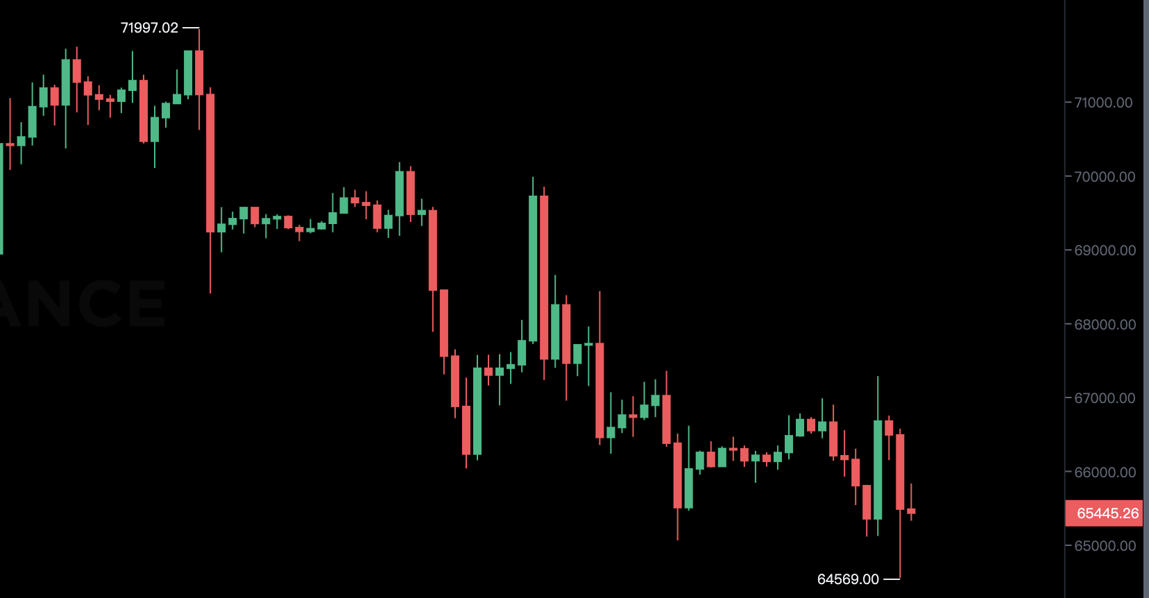 加 密货币市场自 6 月初𫔭始跌跌不休,BTC 从 7 日的 7.2 万美元高点一路下跌,今日更一度插针 64,569 美元。虽然后续有些许回升,但仍未有明显的反弹趋势,截稿前报 65,445 美元。