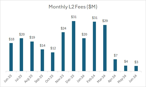 目前,主要的L2代币的总 FDV 约为 400 亿美元,年化费用为 4000 万美元,估值倍数约为 1000 倍。