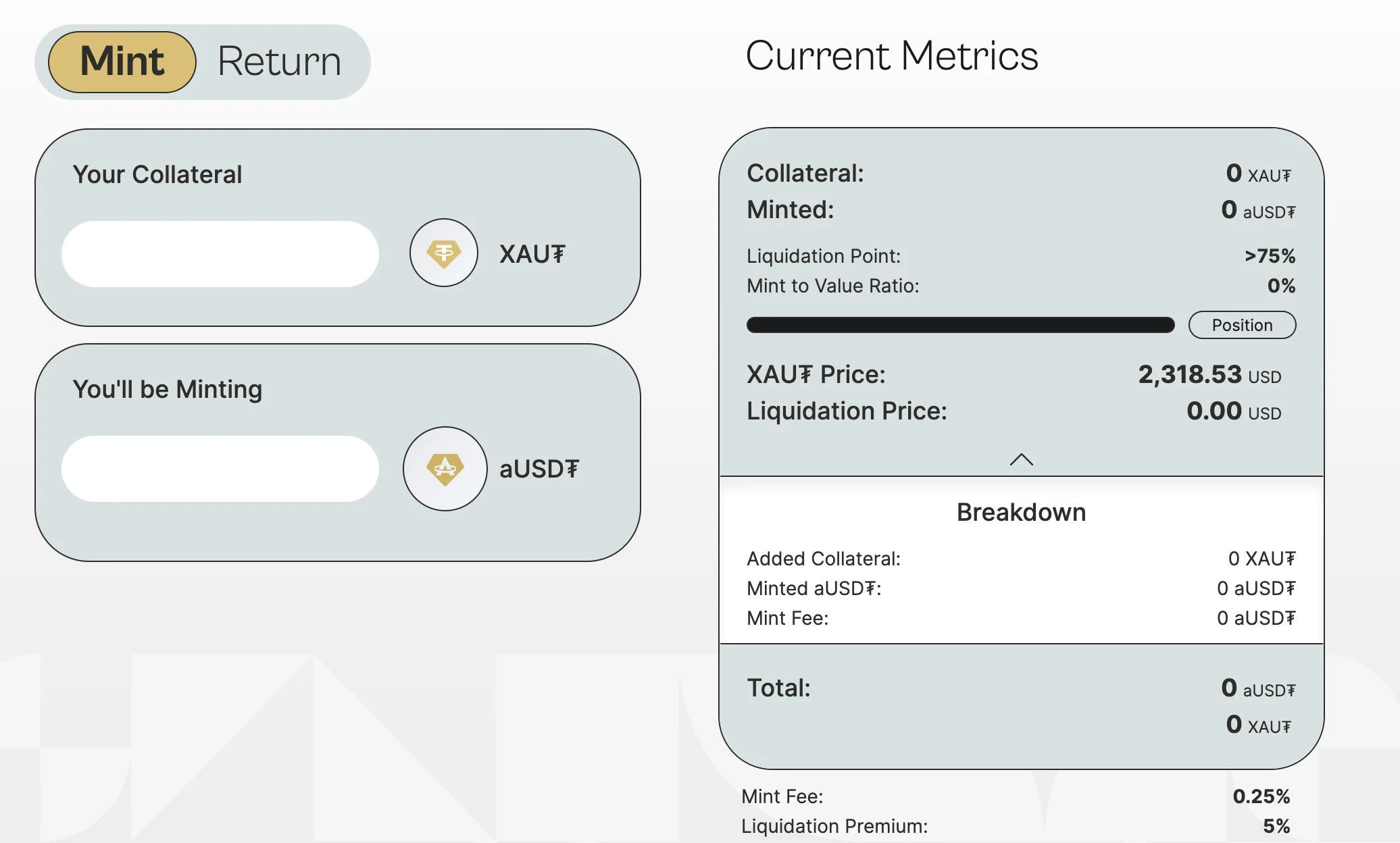 Vaults 是 Alloy by Tether 的核心,可用于存储用户抵押品、未发行的 aUSD₮以及用户抵押铸造头寸(CMP)信息。Vault 会根据清算点或最大 MTV 设定特定的清算阈值,清算点为 75% 。换句话说,如果 CMP 中铸造的 aUSD₮的价值超过用作抵押品的 XAU₮(真实实物黄金支持的 Tether Gold )价值的 75% 时,该 CMP 就有资格被清算。需要注意的是,用户与 Vaults 交互需要通过 KYC 验证。