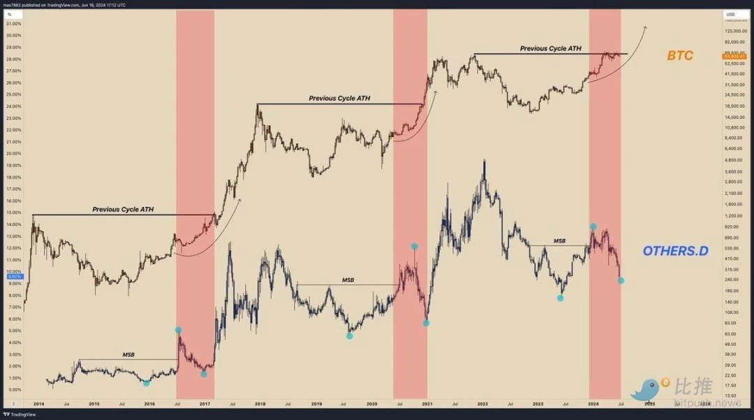 他在推特上写道:「比特币和山寨币继续重复之前每个周期所做的事情,图中上面的曲线是 BTC,下面的曲线是 OTHERS.D(其他代币)。」