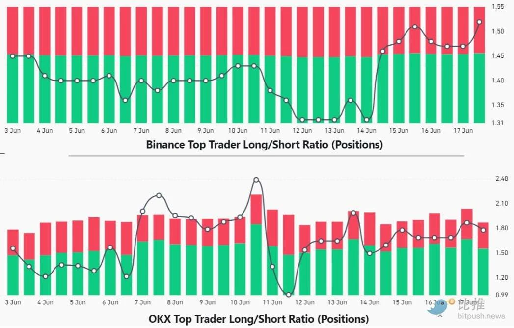 Coinglass 数据显示,币安大户交易员的多空比从 6 月 13 日的 1.32 上升至 1.52 ,表明尽管比特币未能维持 68, 000 美元的支撑位,但对杠杆多头头寸的需求仍然强劲。在 OKX,该指标从 6 月 13 日的 1.65 上升至 1.78 ,表明巨鲸和做市商在比特币跌破 67, 000 美元时增加了净多头头寸。