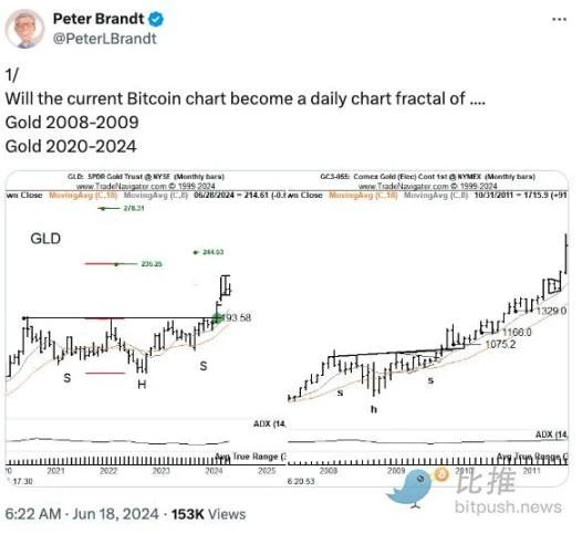 资深交易员 Peter Brandt 指出,当前的比特币图表类似于 2008-2009 年和 2020-2024 年黄金表现的日线图分形,「倒转头肩形态」(Inverted Head and Shoulders)的出现预示着未来的积极走势。