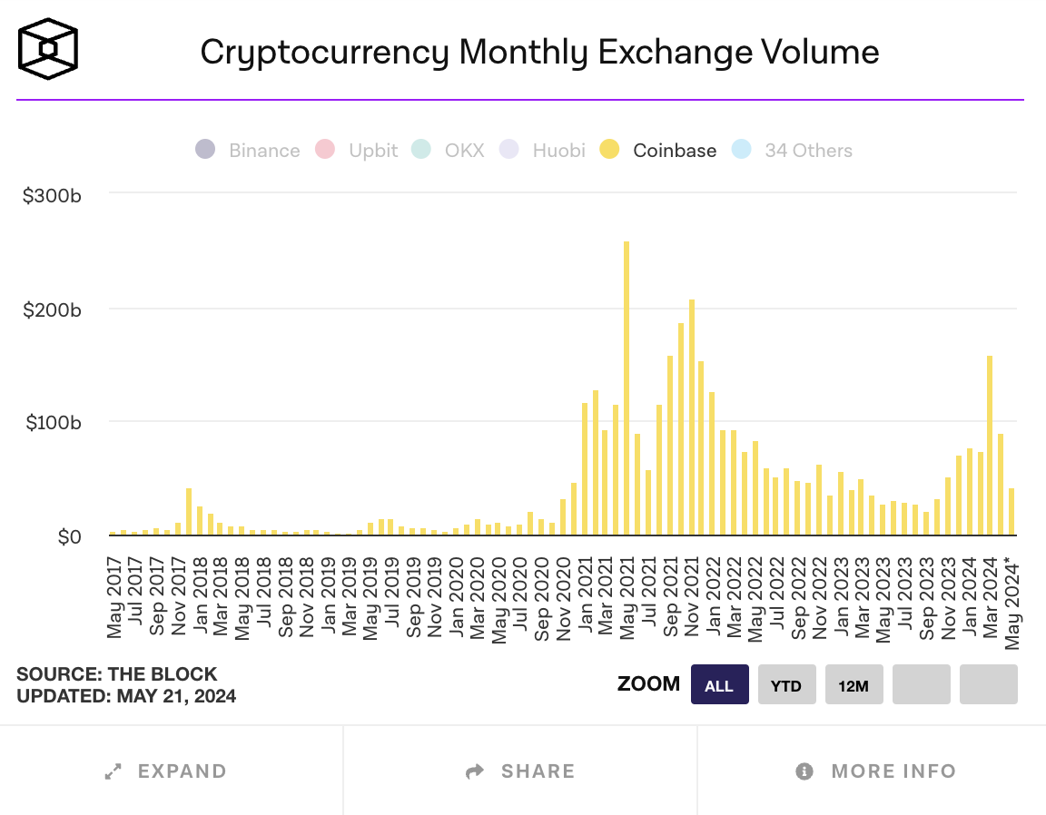交易费仍然占 Coinbase 收入的很大一部分。在第一季度,该平台产生了超过 10 亿美元 的交易费收入(约占其季度收入的三分之二)。