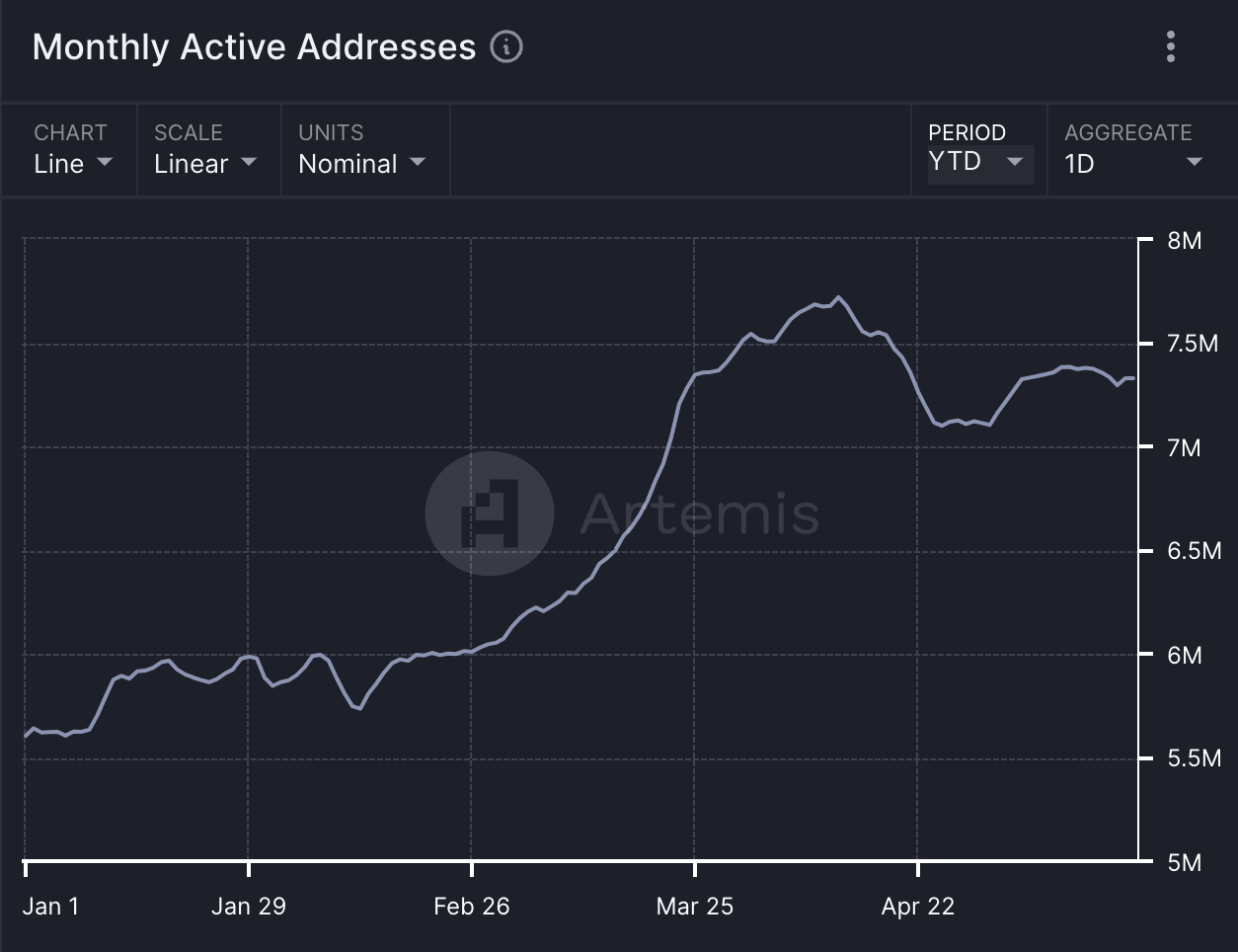 以太坊本身的月活跃地址数量显著增长。30 天平均数今年以来增加了约 30% ,距 2021 年的峰值仅约 10% 。