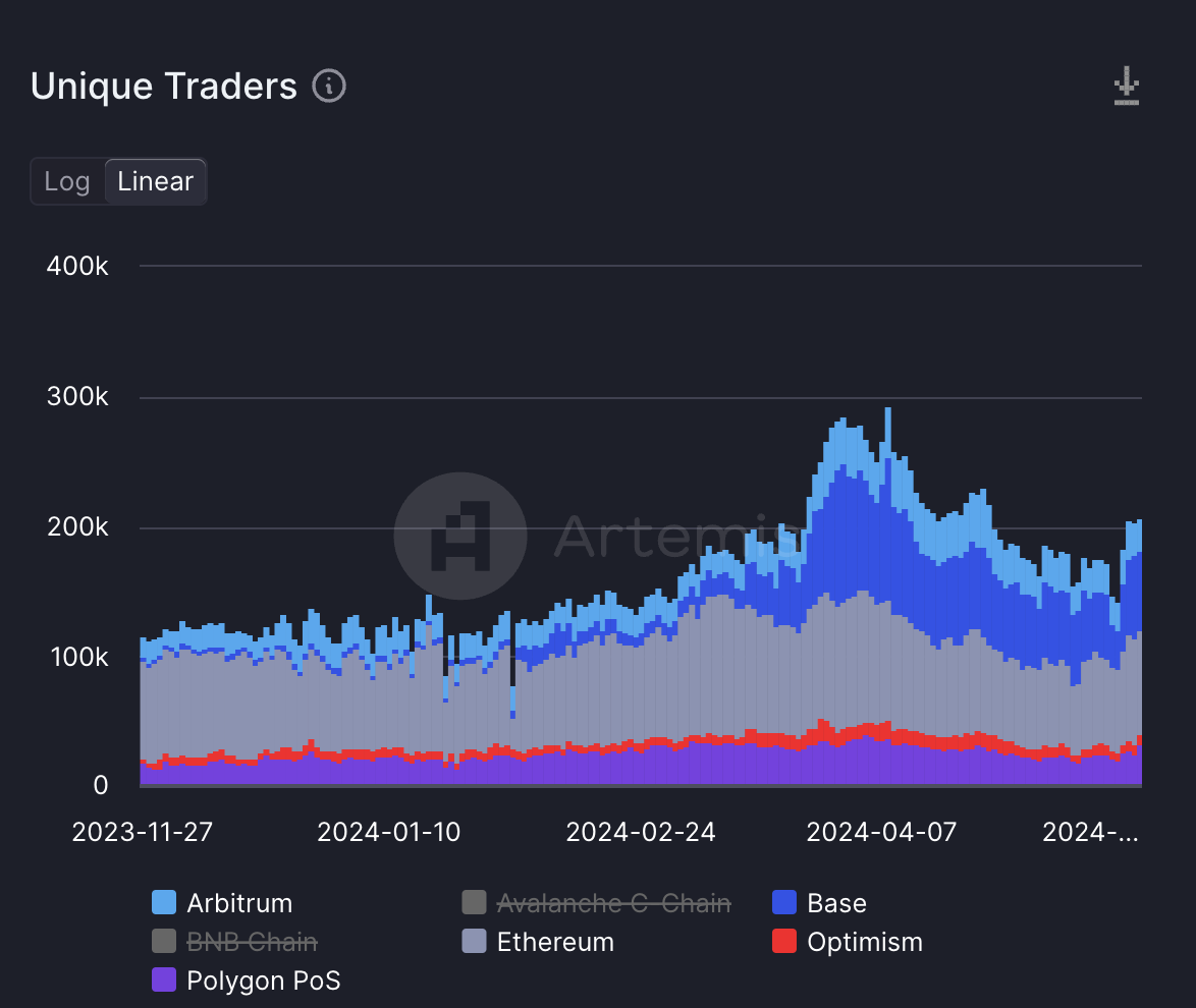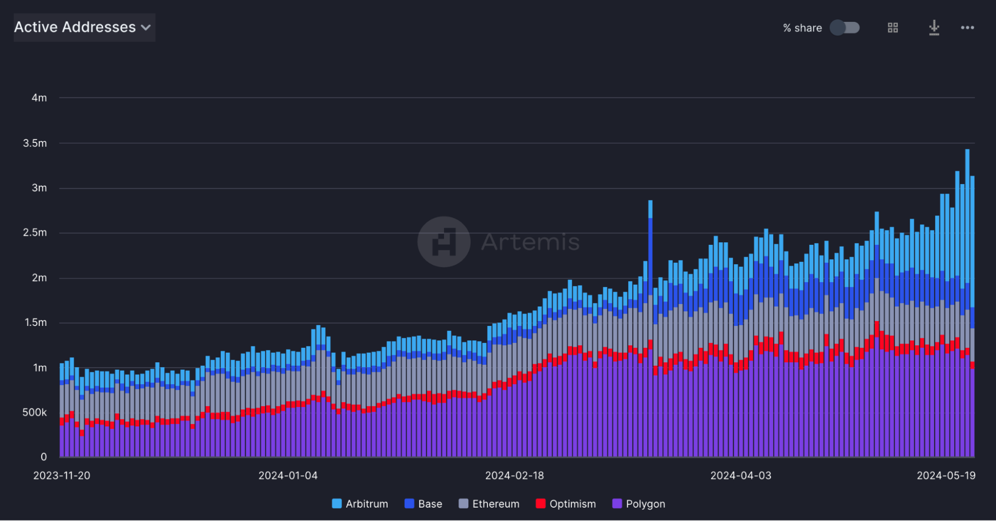 从整体上看以太坊生态系统也有显著的增长。下面汇总了五条顶级以太坊生态链(以太坊、Arbitrum、Base、Optimism 和 Polygon)的日活跃地址。选择这五条链是因为它们拥有丰富的生态系统和开发者。