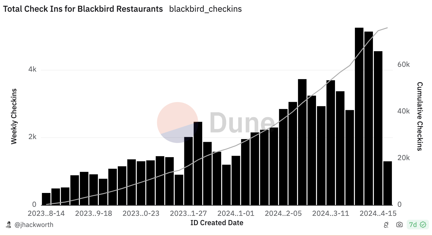 Blackbird 是一个为餐饮业建立的忠诚度和奖励计划,采用加密货币作为底层技术。当用户在关联 Blackbird 的餐厅签到时,该应用会为他们铸造一个 NFT,这也是网络内餐馆了解客户用餐习惯的数据点。目前 Blackbird 业务主要服务于纽约市。