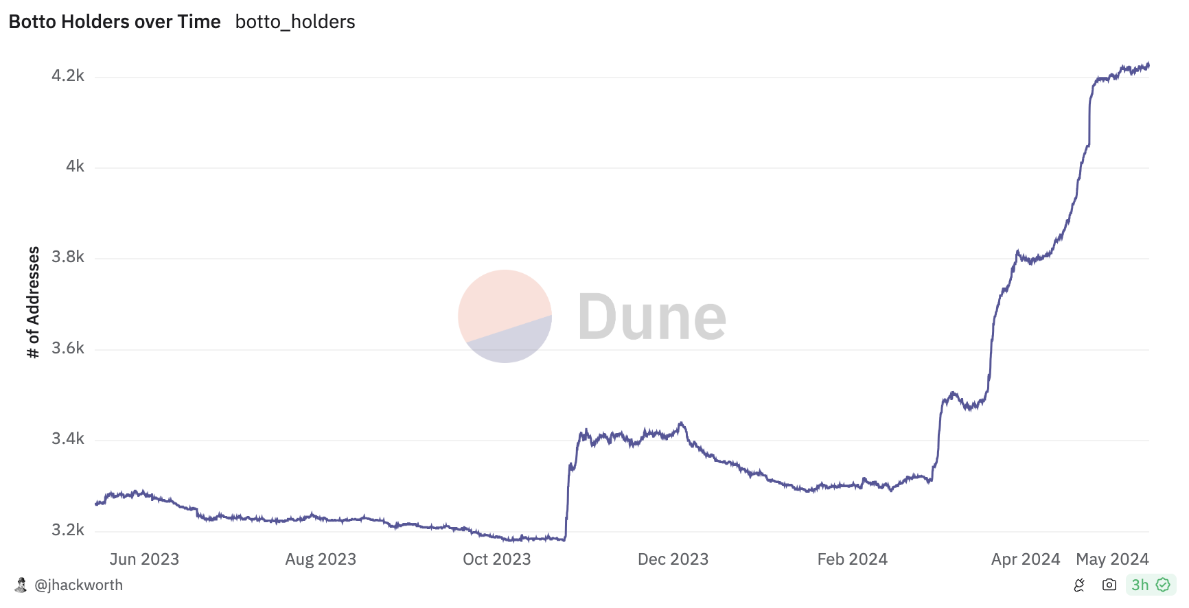 一些这样的模型正在被构建,Botto 就是其中之一,它是一个自主艺术家,BOTTO 代币持有者每周都有能力帮助训练模型。 Botto 的艺术作品质量很好并且会越来越好,每周拍卖会上 Botto 作品的价格不断上涨就是明证。在此过程中,所有者和参与者网络也在不断增长: