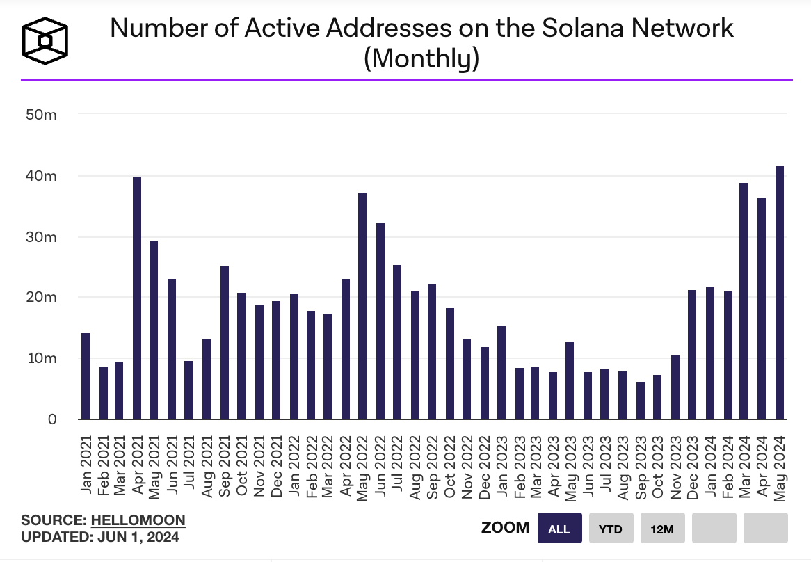 与 Solana 交互的日活跃地址数量比去年同期高出 2-3 倍 ,大致与 2021 年周期中的最高活跃期一致。月活跃地址数量在同一时间范围内增加了 3-4 倍, 2024 年 5 月达到了新的历史高点: