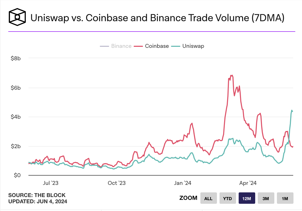 Uniswap(协议)促成的 7 天平均流动交易量最近也超过了 Coinbase: