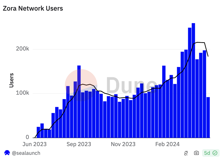 Zora Chain(也称为 Zora Network )已上线大约一年。在此期间,该网络继续稳定发展,周活跃用户数量今年以来增长了约 60% ,最近创下超 25 万的新高。该链的利润率约 34% ,这意味着用户为交易花费的近 1/3 的 ETH 都被 Zora 收取。