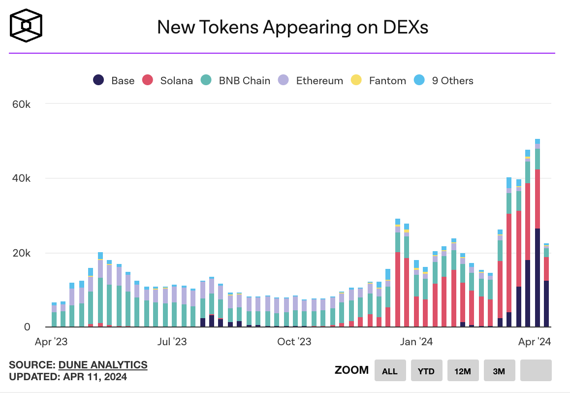 在 DEX(去中心化交易所)上可观察出,新创建的代币数量正不断增加,并且主要在 Base 和 Solana 链上。