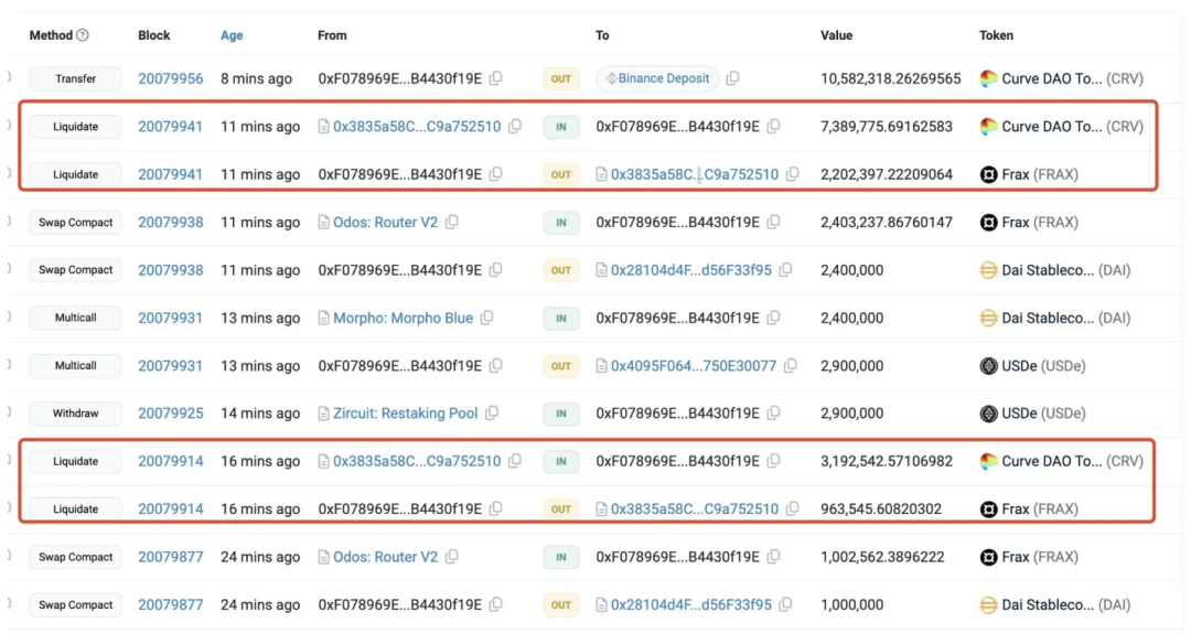 价格下跌引发的其余借贷平台清算,Fraxlend 的贷款人遭受数百万美元的清算,据 Lookonchain 监测,有用户在 Fraxlend 上被清算 1058 万枚 CRV(330 万美元)。