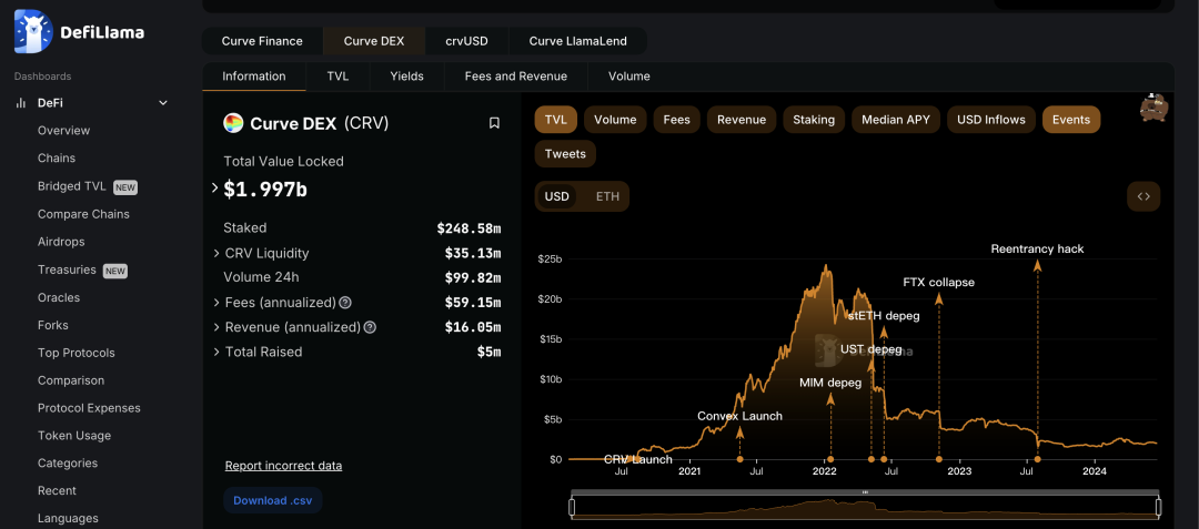 同样面临的巨大损失还有早期 CRV 投资者和其生态内其他投资者,根据 DeFiLlama 数据,截止 6 月 18 号,Curve 的 tvl 已经降到了 19 亿美元,比起 2022 年高点的 230 亿美元,TVL 已缩水至不到原来的十分之一,在 DeFi 市场的排名也已降至 15 名开外。